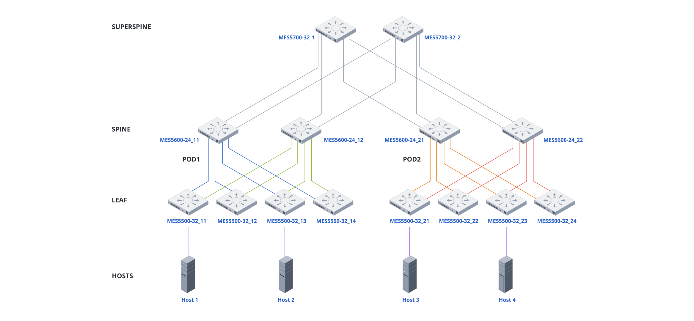 MES5700-32 создан для сценариев, где порты 100G уже могут быть ограничением: крупные ЦОД, облачные платформы, вычислительные кластеры. В IP-фабрике на основе оборудования Eltex модель закрывает уровень Super-Spine – собирает и агрегирует трафик со всех нижестоящих ЦОД-коммутаторов. Там, где нужны подключения хостов к портам 100G, коммутатор может выступать на уровне Spine.
