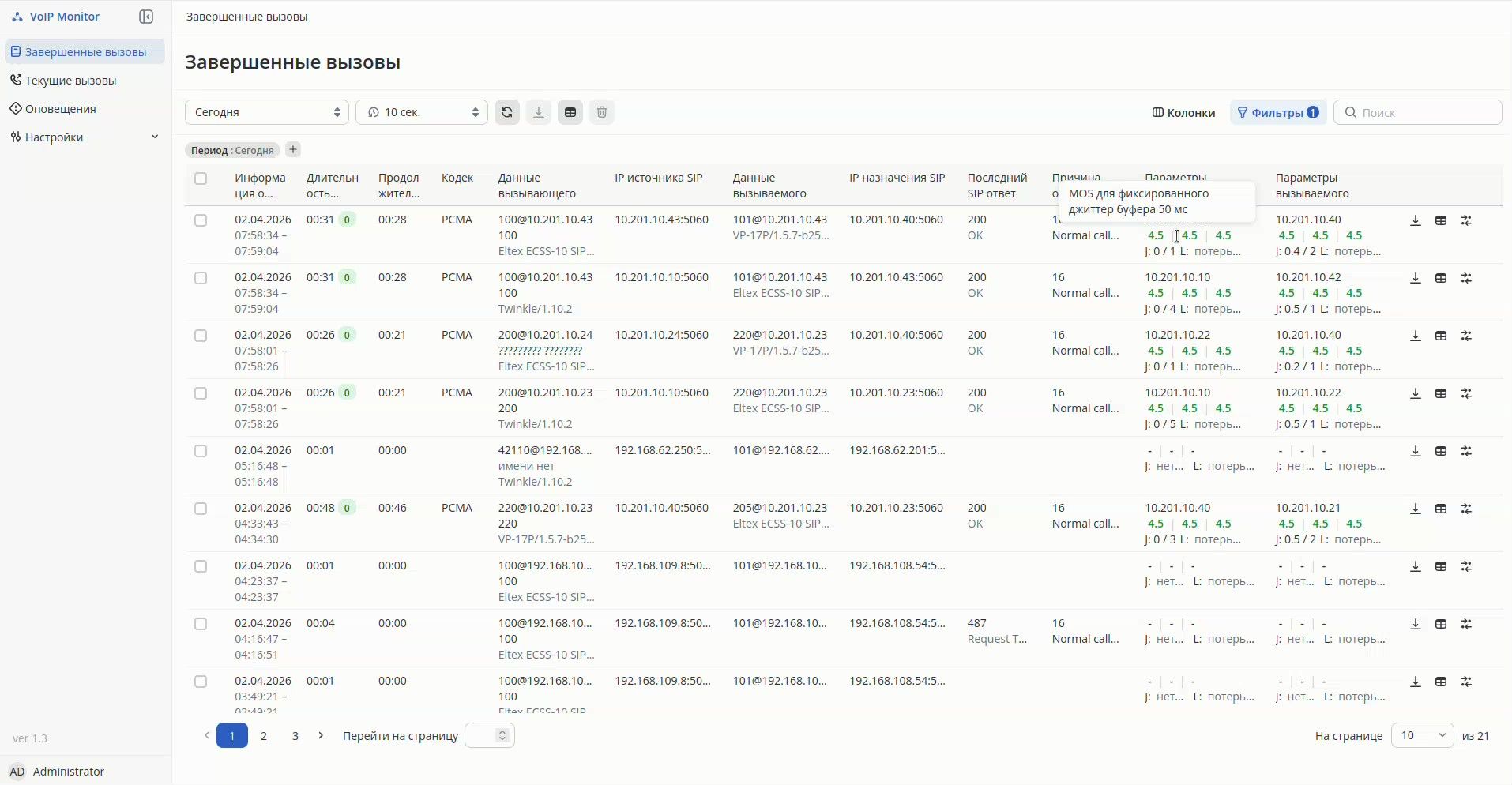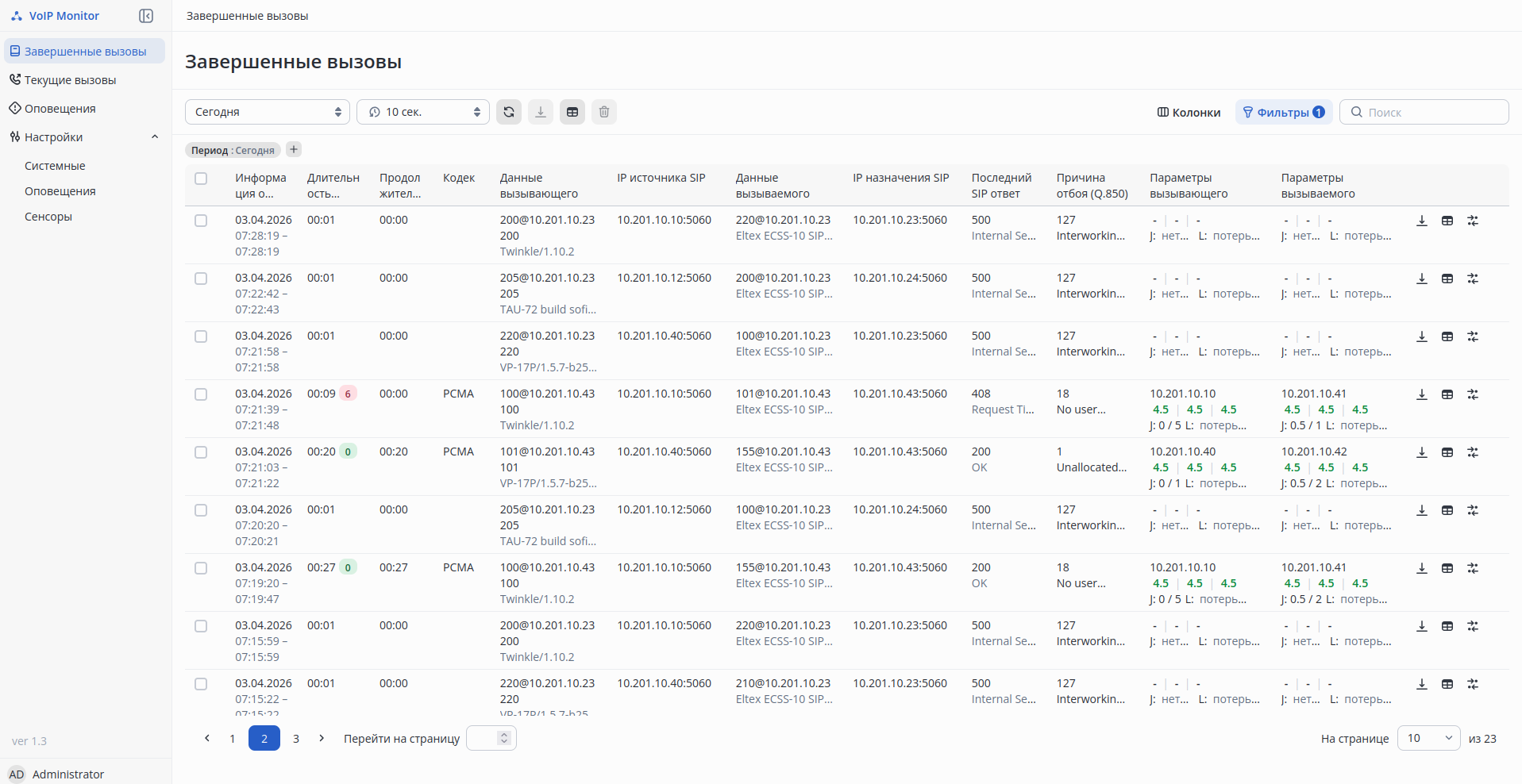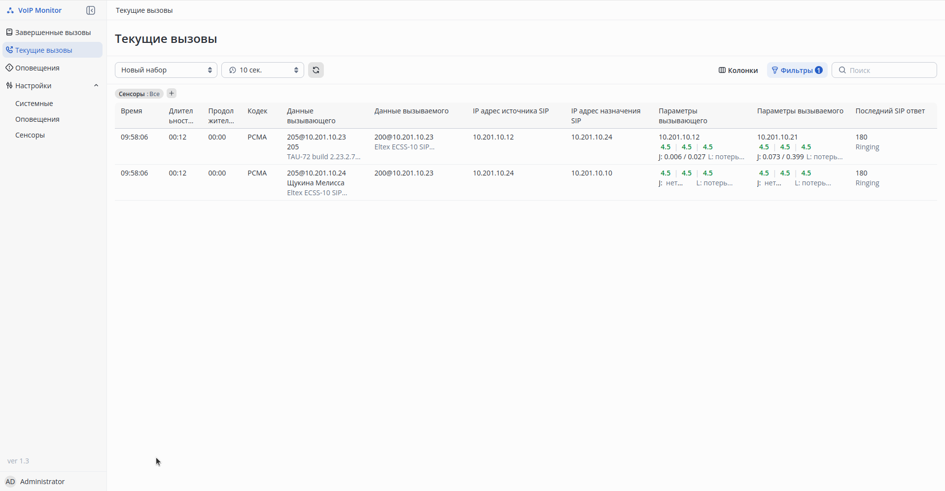 Раздел Active Calls отображает все активные вызовы и их параметры качества прямо в момент разговора.
